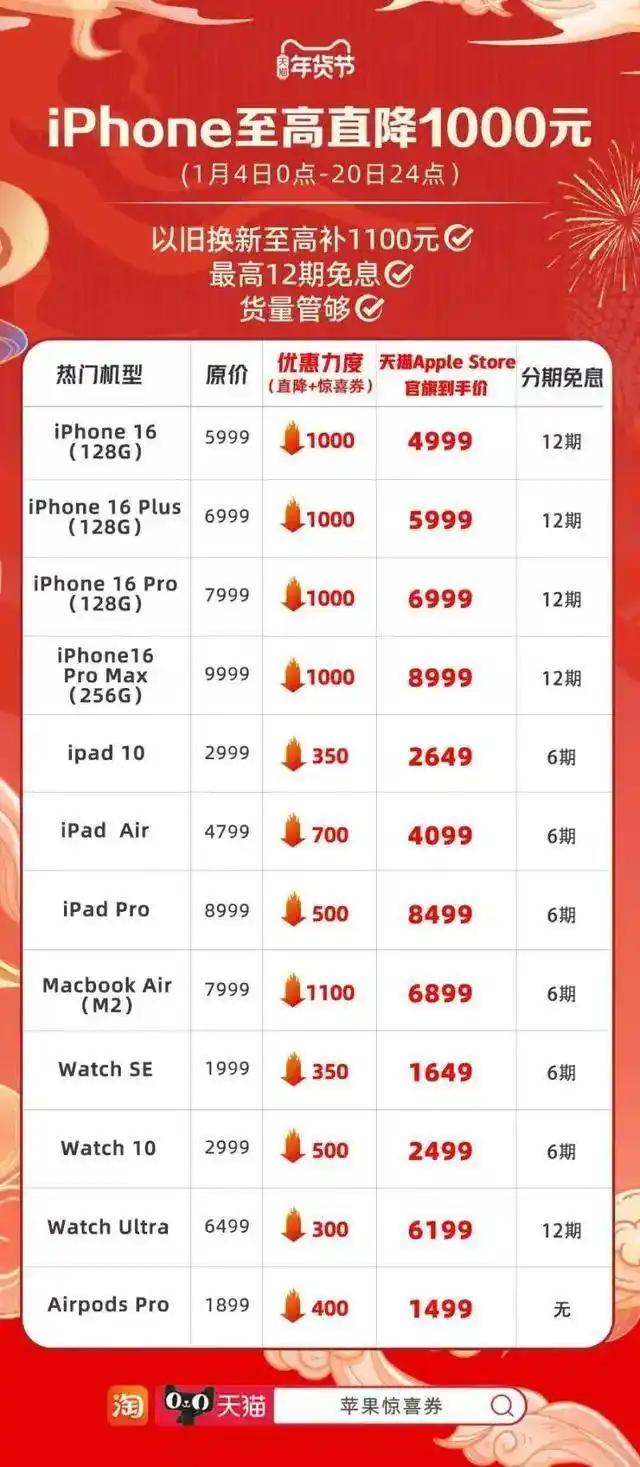 另外,其他全线产品叠加苹果惊喜券和分期免息后,也将跌破官方渠道的全网底价,可以说是前所未有。
