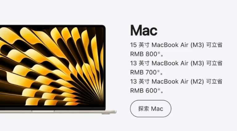 相对来说,Mac 产品的优惠力度在本次促销活动中最大,还算有那么点诚意,其中 15 英寸的 M3 MacBook Air 直降 800 元。