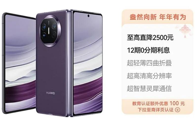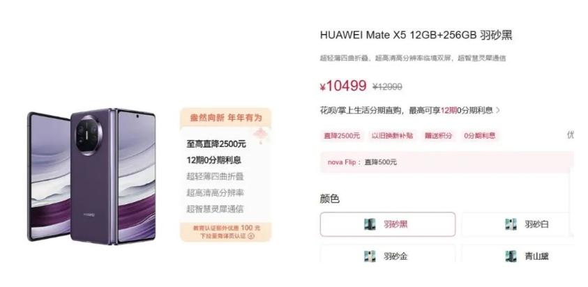 而 Mate X5 折叠屏手机,居然直降 2500 元。其中,原价 12999 元的12GB+256GB 版本,优惠后售价 10499 元。