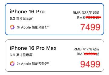 iPhone 16 Pro 和 iPhone 16 Pro Max,直降 500 元,从官网的原价 7999 元和 9999 元分别降至 7499 元和 9499 元。