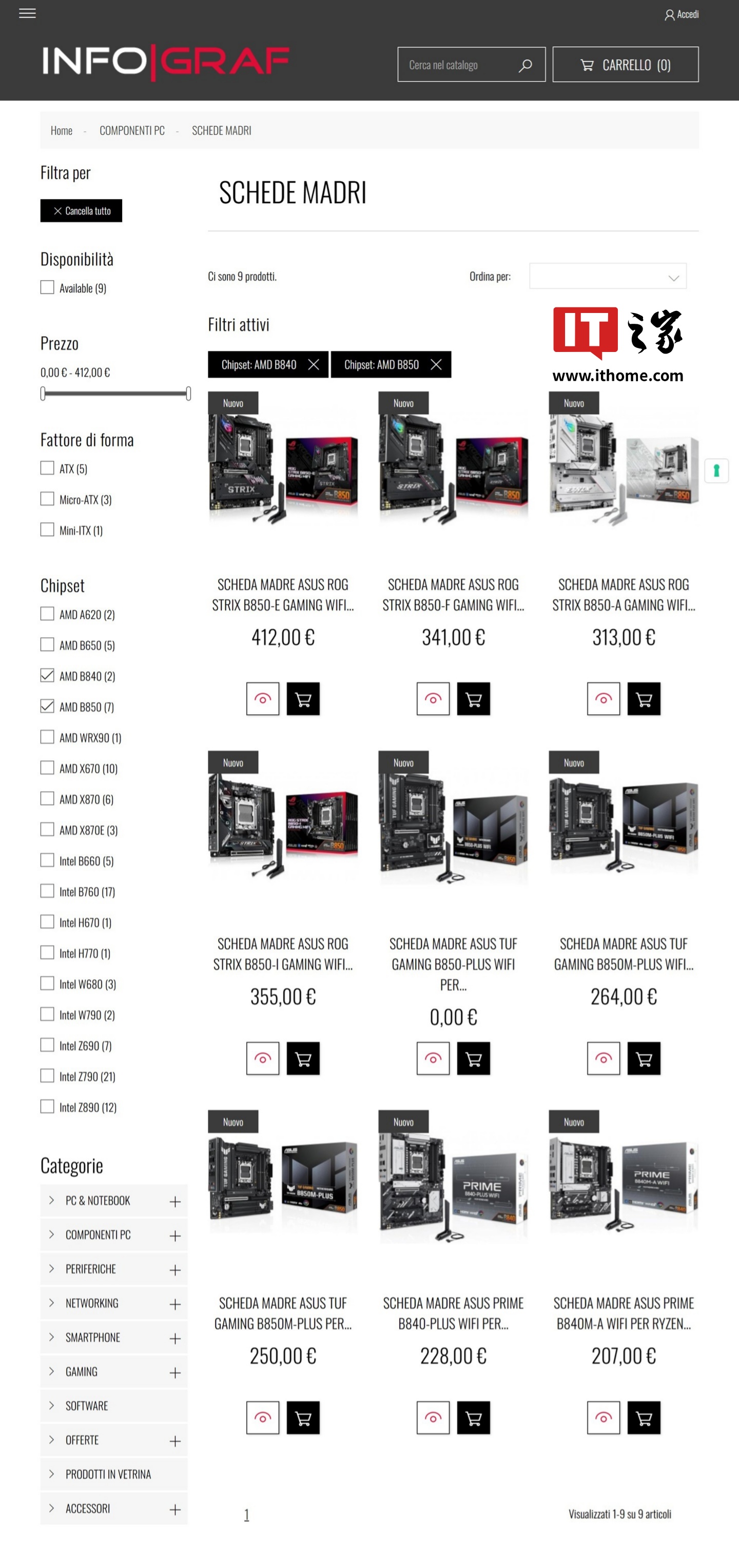 IT之家 1 月 6 日消息,X 平台消息人士 188号 (@momomo_us) 注意到,意大利华硕经销商 INFO|GRAF 在 CES 2025 正式发布之前上线了 9 款 AMD B850、B840 芯片组主板,覆盖从 PRIME 到 ROG STRIX 的产品线,标价 207~412 欧元(当前约 1564 ~ 3113 元人民币)。