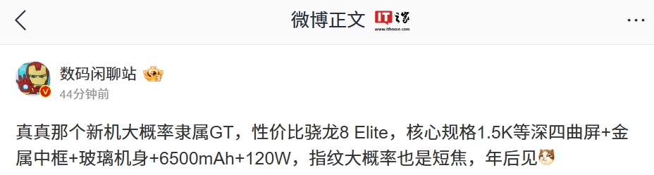 IT之家 1 月 6 日消息,博主 @数码闲聊站 今日发文透露,真我新机“大概率”隶属 GT,定位“性价比骁龙 8 Elite”,配备 1.5K 等深四曲屏 + 金属中框 + 玻璃机身 + 6500mAh 电池(支持 120W 快充),“大概率”使用短焦指纹。
