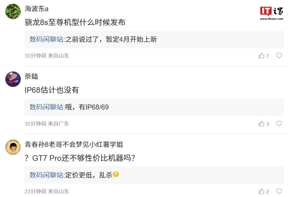 结合评论区讨论来看,这款新机预计为 realme 真我 GT 7 手机。博主还回复了部分网友的问题:针对骁龙 8s 至尊版处理器机型上市时间,博主回复“之前说过了,暂定 4 月开始上新”;针对新机是否支持 IP68,博主称“哦,有 IP68/69”。