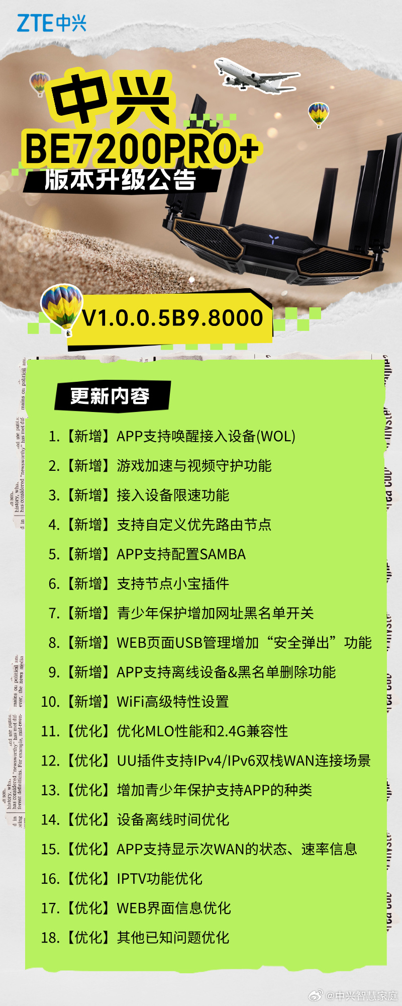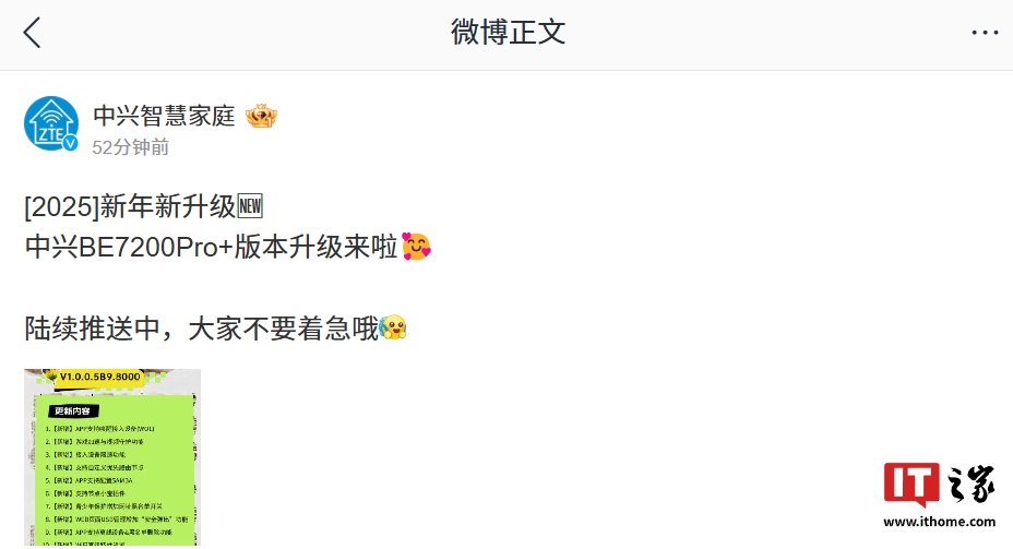 IT之家 1 月 6 日消息,中兴今日发布 BE7200Pro+ 路由器固件更新(陆续推送中),版本号为 V1.0.0.5B9.8000,新增支持 App 唤醒接入设备等功能。