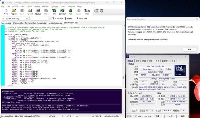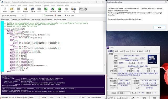 Intel酷睿Ultar 7 258V在POV-Ray测试中,单核成绩为751 PPS,多核成绩为4228 PPS。