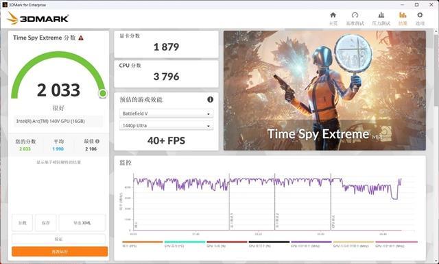 在3DMark的Time Spy Extreme(DX12+4K渲染分辨率)测试中,总成绩为2033,其中锐炫140V核显的分数为1879。