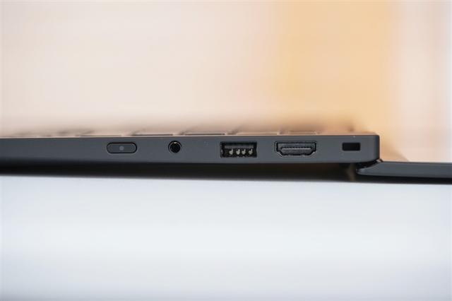 联想ThinkPad X1 Carbon Aura AI 2025笔记本的机身右侧依次设置了电源键、3.5mm音频接口、全尺寸USB-A接口、HDMI2.1视频接口和防盗锁孔。