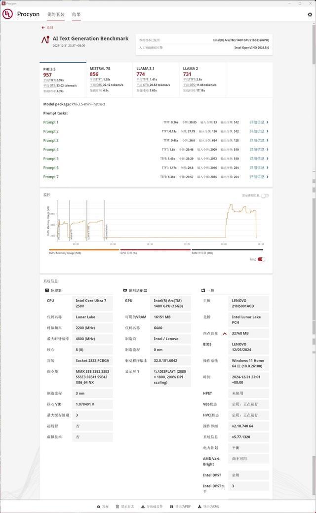 Intel酷睿Ultra 7 258V所搭载的锐炫140V核心显卡在测试中四个模型的得分分别是957、856、774和731。