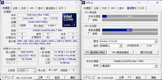 酷睿Ultra 7 258V在CPU-Z测试基准中,单线程成绩为742.3,多线程为4872.7。