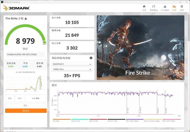 在3DMark的Fire Strike(DX11+1080P渲染分辨率)测试中,总成绩为8979,其中锐炫140V核显的分数为10105。