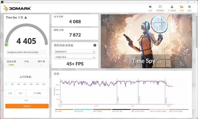 在3DMark的Time Spy(DX12+2K分辨率渲染)项目中,总得分为4405,其中锐炫140V核显的分数为4088。