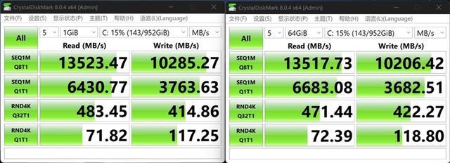 CrystalDiskMark测试中,1GB下连续读取速度超过13.5GB/s,连续写入速度超过10GB/s,4K随机读写速度分别是71.82MB/s和117.25MB/s。64GB下测试结果没有明显区别,性能表现非常稳定。