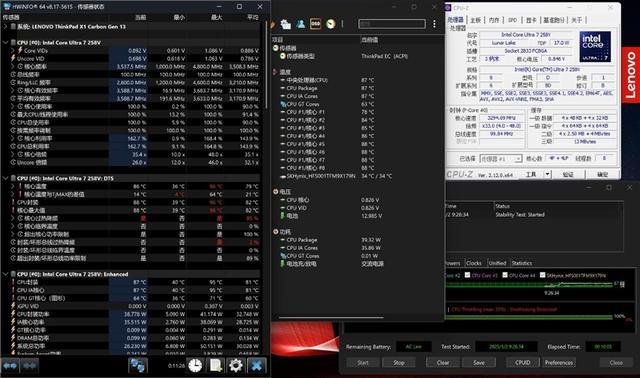 我们用AIDA 64对联想ThinkPad X1 Carbon Aura AI 2025笔记本进行烤机测试,可以看到联想ThinkPad X1 Carbon Aura AI 2025所搭载的Intel酷睿Ultra 7 258V处理器的峰值功率短时间曾超过40W。经过10分钟的烤机,最终稳定在38W左右,此时CPU工作频率为3.5GHz,温度88度。
