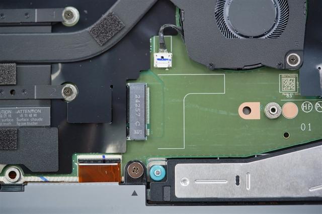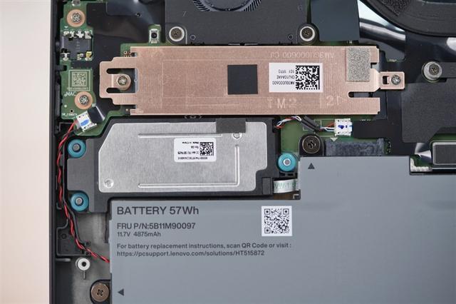 在电池和SSD之间的银色部分是通常轻薄商务本上见不到的巨大的扬声器共振腔。