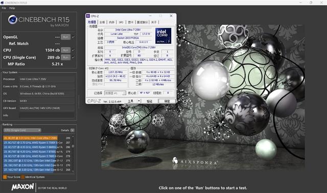 酷睿Ultra 7 258V在CINEBENCH R15测试中,单线程成绩为289,多线程为1504。