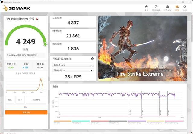 在3DMark的Fire Strike Extreme(DX11+2K渲染分辨率)测试中,总成绩为4249,其中锐炫140V核显的分数为4337。