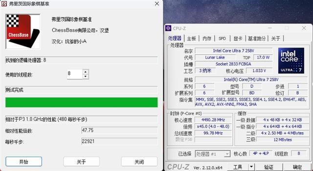 在国际象棋测试中,酷睿Ultra 7 258V的相对性能倍数为47.75,每秒22921千步。