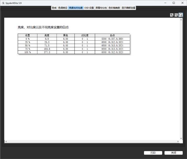 在SDR设置下,可以看到屏幕最大亮度可达377nits,同时得益于OLED可以完全关闭像素的特性,黑色亮度可以直接降低到无法测量的程度,对比度趋近无限大的理论值。