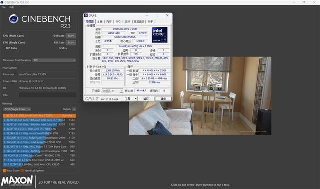 酷睿Ultra 7 258V在CINEBENCH R23测试中,单线程成绩为1875,多线程为10466。