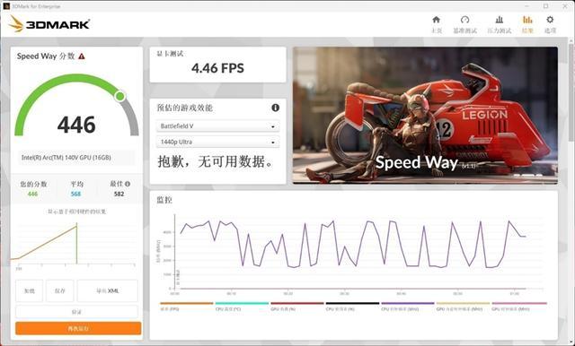在3DMarks Speed Way测试项目中,锐炫140V核显得分为446。