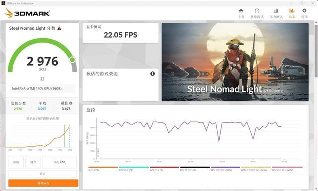 在3DMarks针对集成显卡的Steel Nomad Light测试项目中,锐炫140V核显得分为2976。