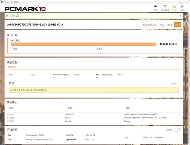 我们用PCMarl10对联想ThinkPad X1 Carbon Aura AI 2025笔记本进行电池续航测试。可以看到联想ThinkPad X1 Carbon Aura AI 2025笔记本使用内置的57Wh电池在PCMark10的经典办公场景下足足坚持了15小时40分钟。