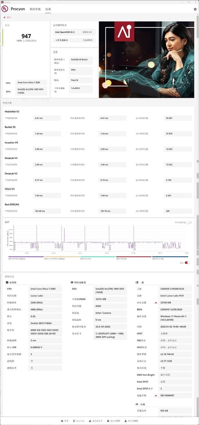 使用OpenVINO引擎,精度Float16,对NPU进行测试,最终得分947分,高于单独使用CPU或GPU的成绩。
