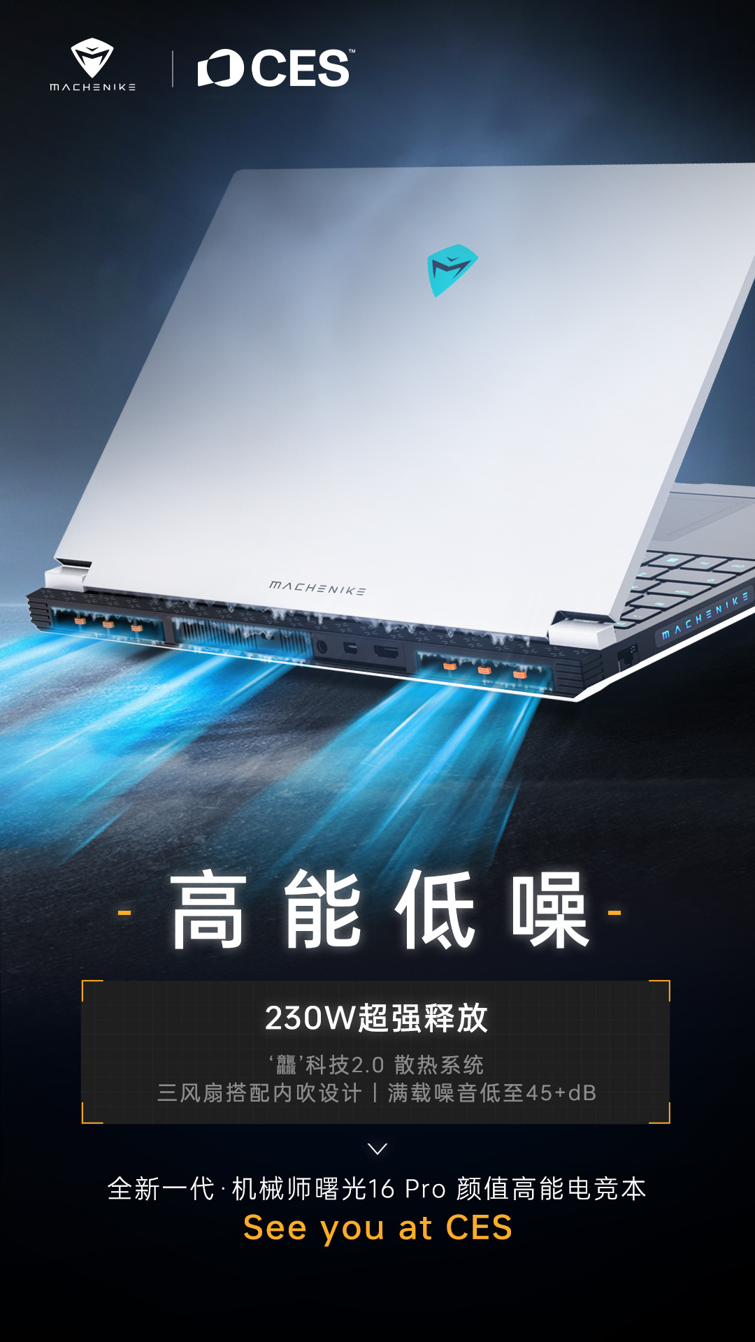 新一代机械师曙光 16 Pro 拥有 230W 性能释放,搭载了‘龘(dá)’科技 2.0 散热系统,三风扇搭配内吹设计,号称满载噪音低至 45+dB。