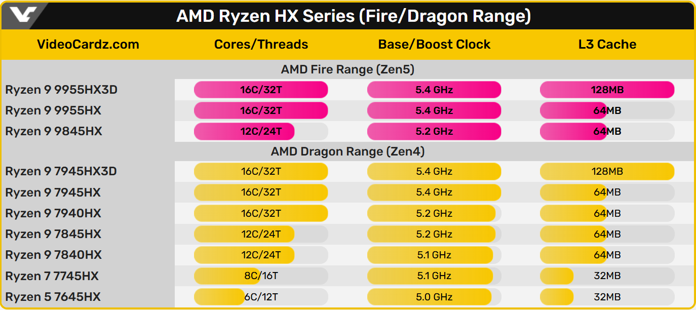 AMD 本次直接推出了 X3D 版本,锐龙 9 9955HX3D 是旗舰型号,配备 16 个核心,总共 144MB 缓存。不过,这款 CPU 预计将保留给最高端的游戏笔记本。