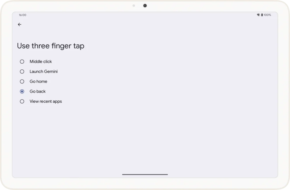 值得注意的是,在可自定义的选项中,“鼠标中键点击”和“启动 Gemini”是新增的功能。其余操作实际上已可通过其他触控板手势实现。例如,三指左右滑动可实现返回操作,三指向上滑动可回到主屏幕,三指向上滑动并按住则可显示最近使用的应用程序。此外,用户还可以通过三指向下滑动打开通知面板,通过四指左右滑动切换应用程序。
