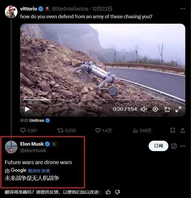 今年圣诞前夕,宇树科技发布了最新机器狗产品B2-W的一段演示视频,马斯克也转发了这条消息,并配文“未来的战争是无人机的战争”。
