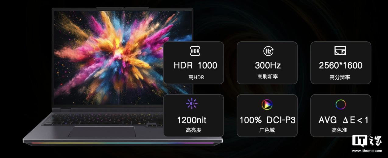 两款笔记本均搭载 16 英寸 2560x1600 分辨率 300Hz Mini LED 面板,但官方没有公布具体背光分区信息,笔记本面板峰值亮度 1200 尼特,覆盖 100% DCI-P3 色域。