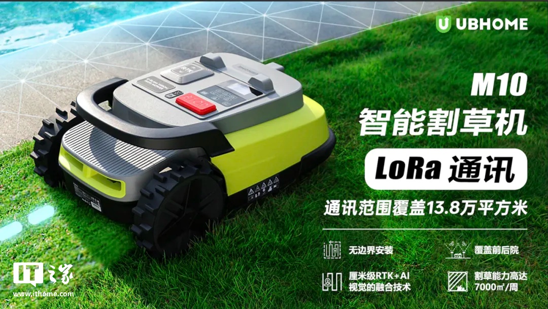UBHOME 智能割草机采用了 LoRa 通信模块设计,支持 13.8 万平方米的大范围信号连接