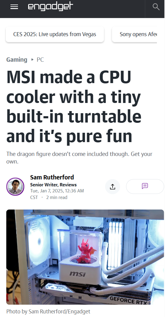 据外媒 Engadgt 晒出的图片和视频,这款 CPU 散热器采用白色外观,配有一个平面的旋转底座,顶部还有一个透明的盖子,可以打开放置一些手办,比如微星在里面放置了一个官方的小龙公仔。