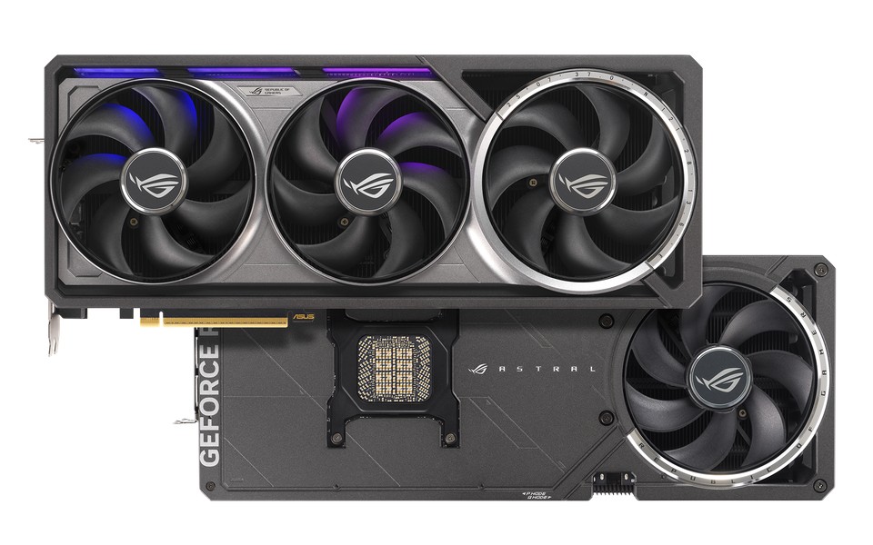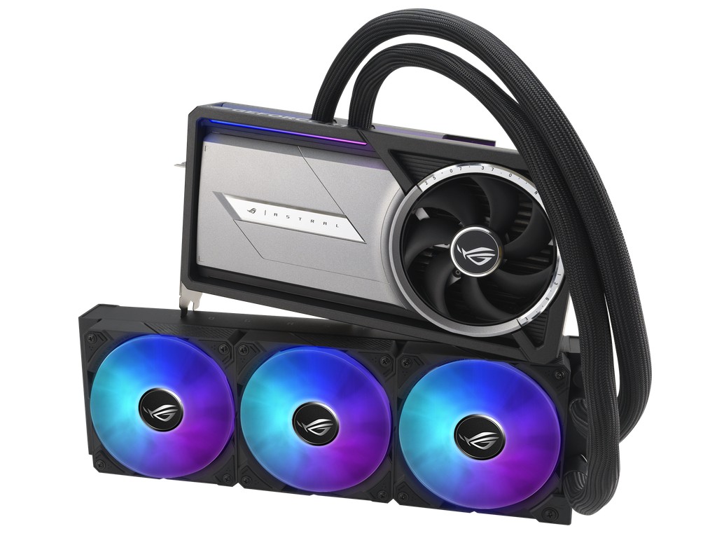 其中 ROG ASTRAL 显卡风冷版本采用前方 3 风扇 + 后方 1 风扇的散热组合,水冷 LC 版本则是冷排 3 风扇 + 本体 1 风扇,均在 ROG 显卡产品线首度引入了四风扇设计。