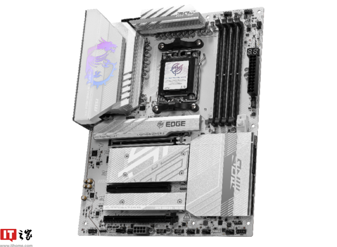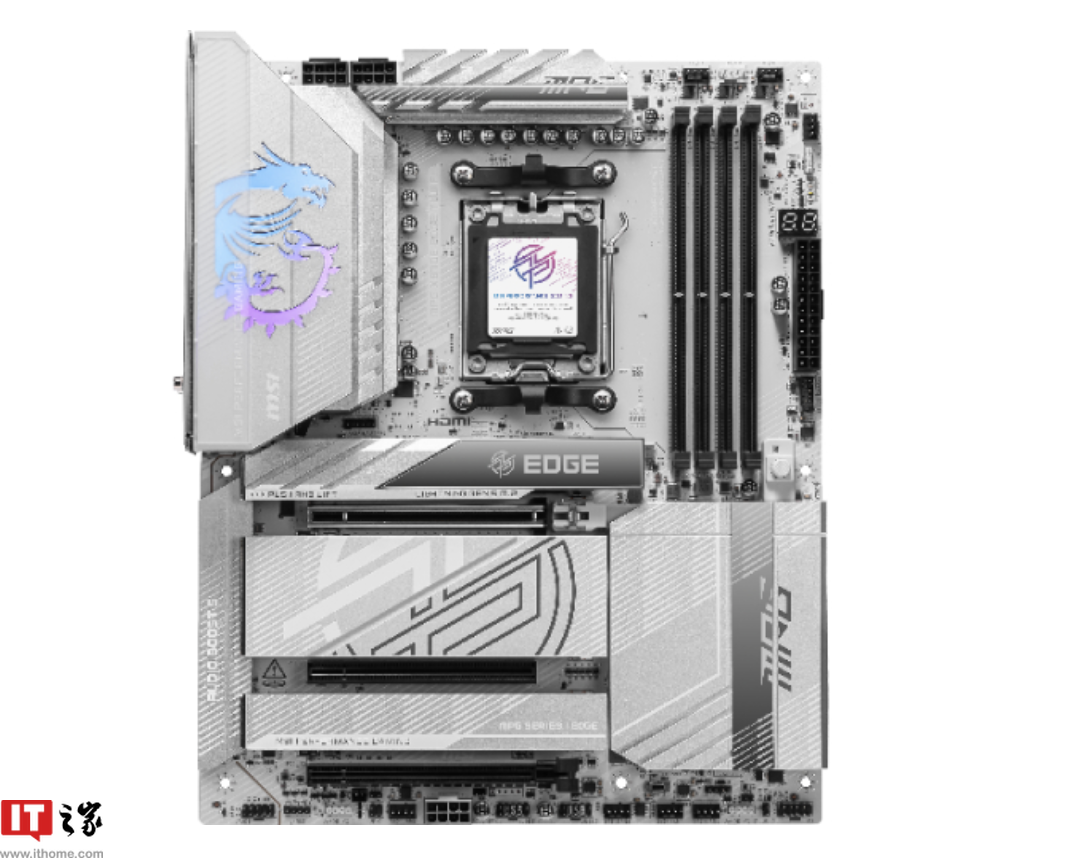 这款主板整体采用白色设计,其供电散热片上配备 RGB 微星“龙”风格徽记,主板多处带有微星 MPG、EDGE 等标识。