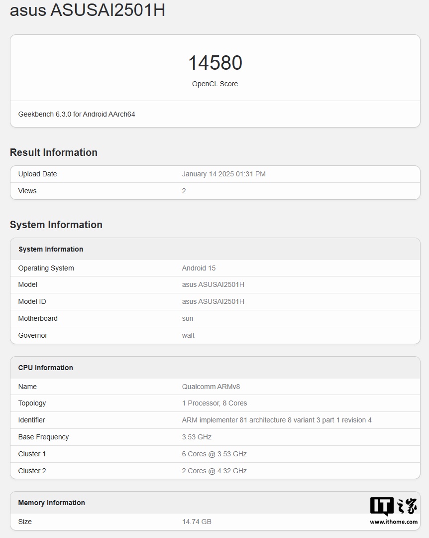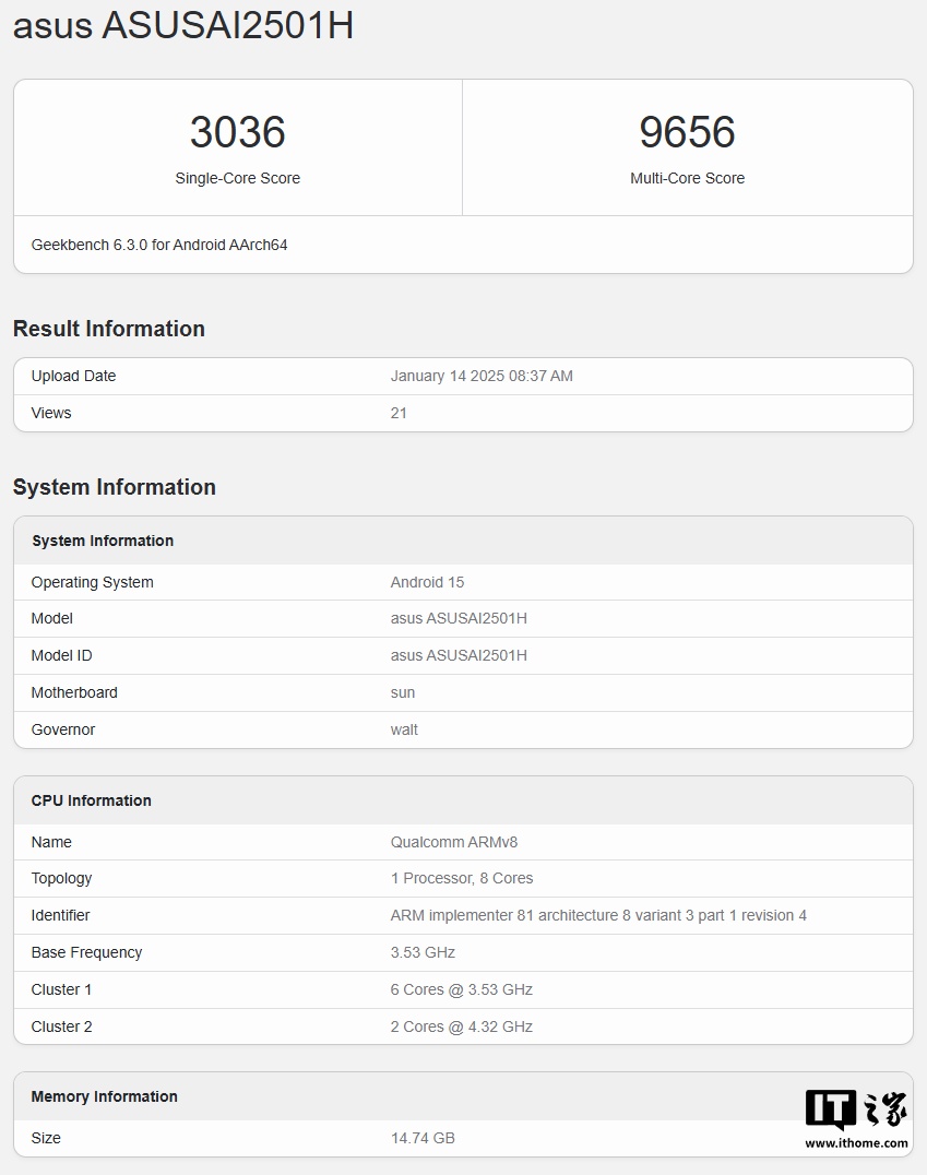 IT之家 1 月 15 日消息,华硕 Zenfone 12 Ultra(ASUSAI2501H)昨日出现在了 Geekbench 基准测试平台上,而这款新机将于 2 月 6 日 14:30 正式发布,IT之家届时将为大家带来详细报道。