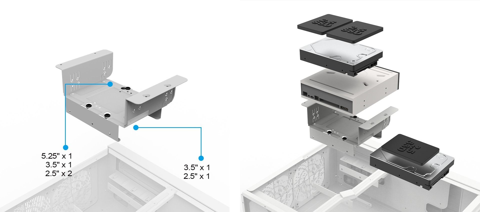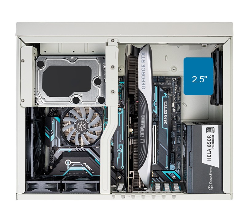 下方“软盘位”后方则能隐藏安装 1 个 3.5 英寸硬盘或 2 个 2.5 英寸硬盘。