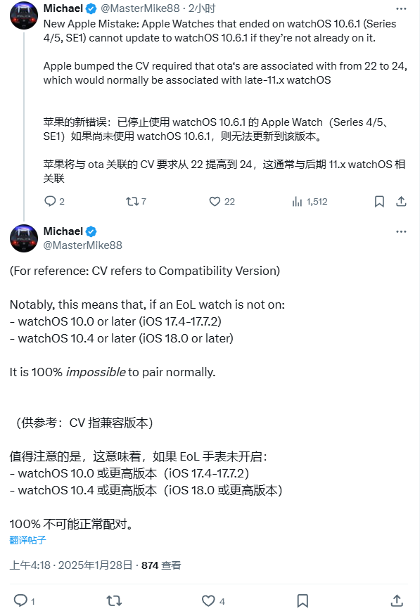 一位名为 Michael 的开发者表示:“苹果搞出了一个新 Bug:停留在 watchOS 10 的 Apple Watch(Series 4/5、SE 1)如果未安装 10.6.1 版本则无法更新到该版本。苹果将 OTA 相关的 CV(配置版本)从 22 提升到 24,这通常与 11.x 后期的 watchOS 相关联。”