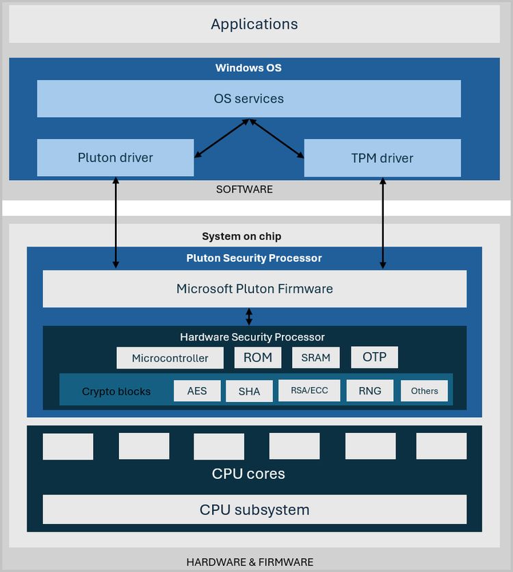 微软于 2020 年首次发布 Pluton 安全处理器,直接在 CPU 片上系统(SoC)的专用硬件上运行,结合硬件、固件和软件,为凭据和加密密钥等敏感资产提供额外保护。