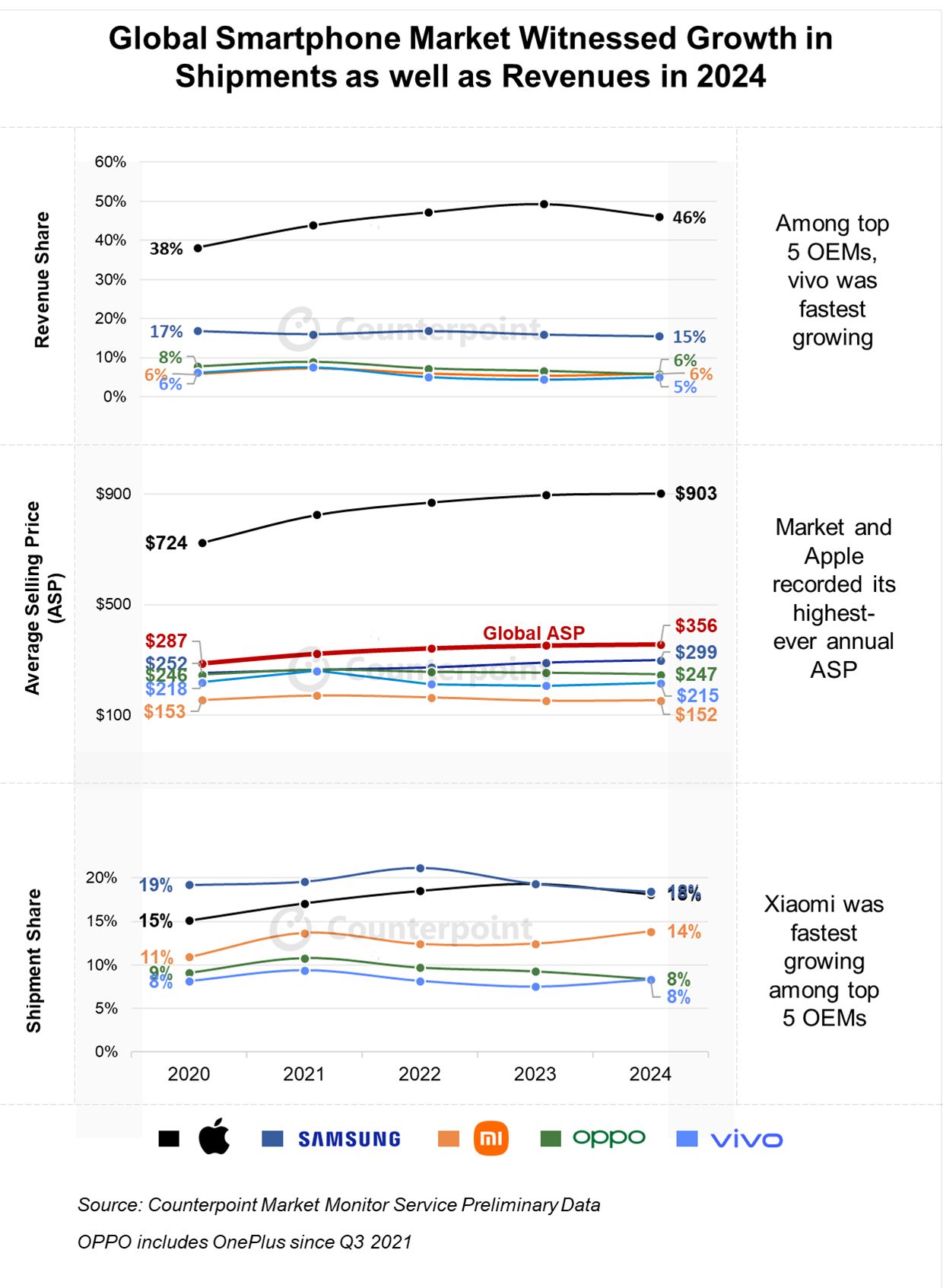 Counterpoint 高级分析师 Shilpi Jain 指出,2024 年智能手机市场呈现诸多积极信号,收入和出货量双双增长。厂商对高端市场的关注,消费者对高端设备的需求以及不断上涨的制造成本,共同推动了平均售价屡创新高。