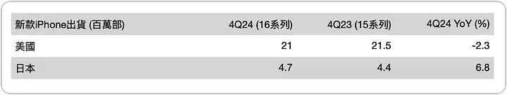 由上表得知,新款 iPhone 在美国 4Q24 出货略微 YoY 衰退。很有趣的,没有提供 Apple Intelligence 的日本市场反而在 4Q24 iPhone 出货有高个位数的 YoY 成长。