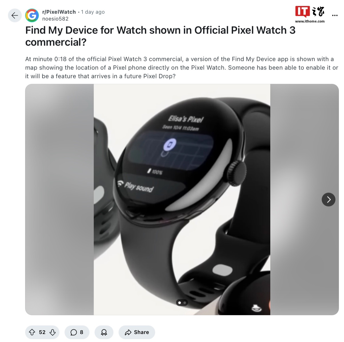 IT之家 2 月 1 日消息,有 Reddit 用户在谷歌最近发布的 Pixel Watch 3 宣传视频中发现了一款 WearOS 原生“查找设备”应用,其中显示有设备地图、设备上一次处于在线状态的日期和时间、在设备上播放声音的按钮以及设备剩余电量。