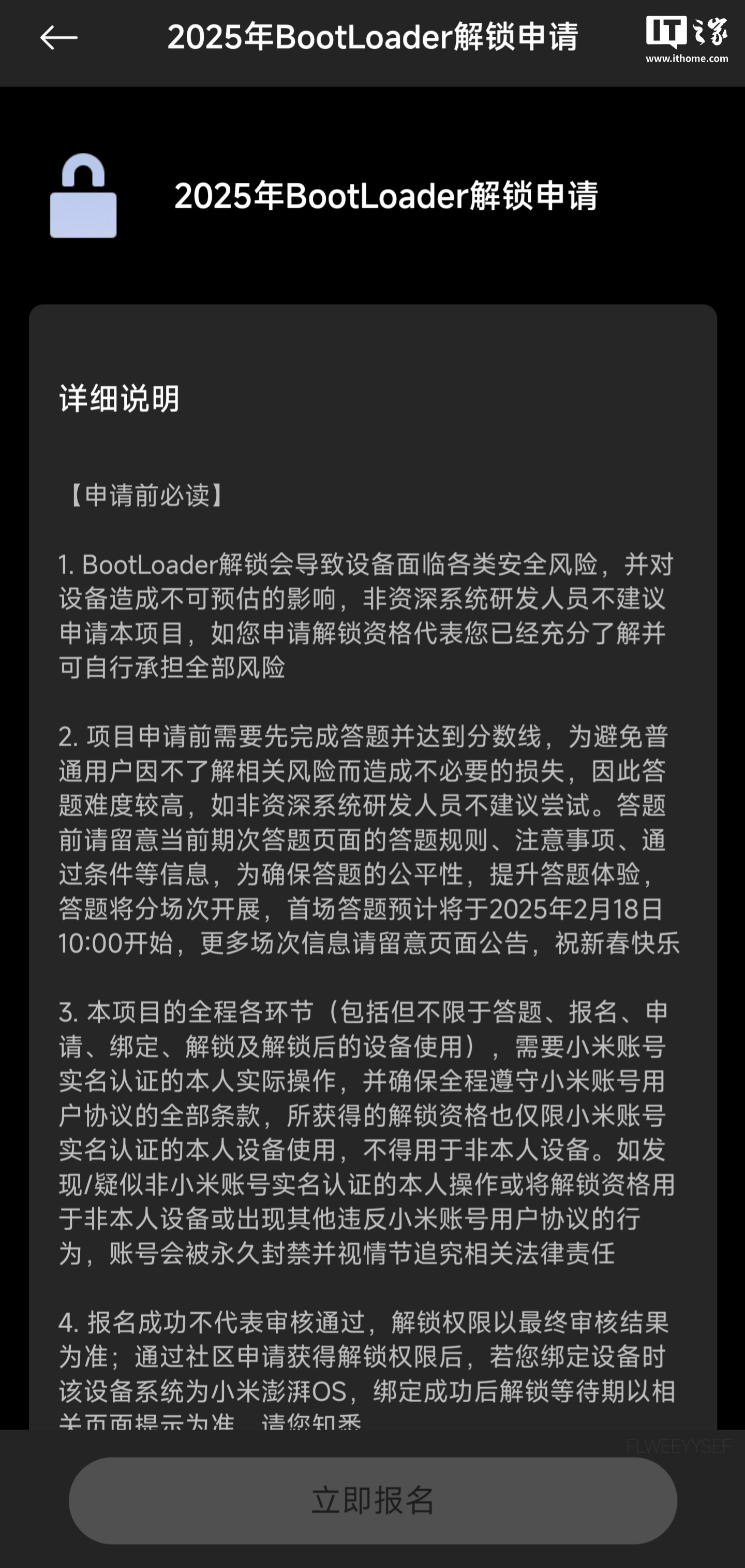 IT之家注意到,小米 2025 年 BootLoader 解锁申请相关页面已更新,其首场答题时间预计将于今年 2 月 18 日 10:00 开始。