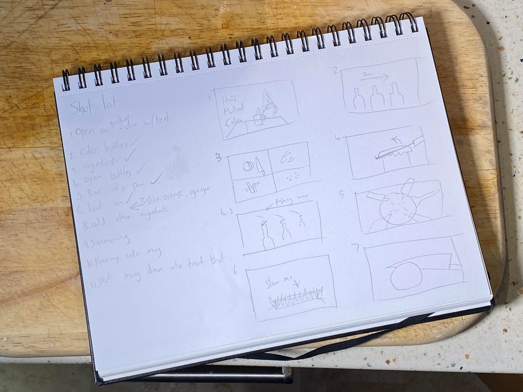 对于我的节日主题视频(嵌入在上方),我决定展示制作热苹果酒的过程。通过保持特定主题,我确定了所需镜头及其顺序,甚至提前绘制了分镜脚本。你无需做到这一步,但心中有个粗略想法会大有裨益。