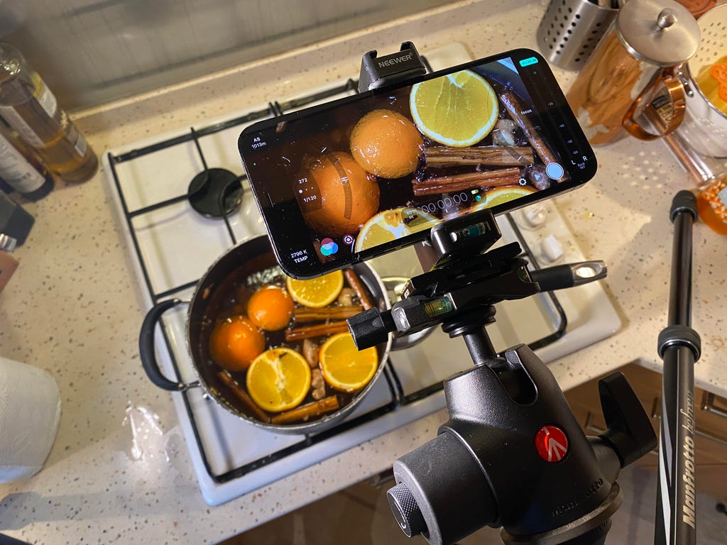 你可以尝试的角度无限,所以想想如何改变。你总是可以重新拍摄某些内容(或设置另一部备用手机或相机用于另一个角度),然后在视频编辑器中剪辑在一起。例如,在我的视频中,我想展示肉桂和生姜被扔进锅里,所以我使用了两个角度:一个是从第一人称视角看向锅里,另一个是把手机放在锅后面,展示我扔食材进去。这样的小元素整体上能产生很大影响。