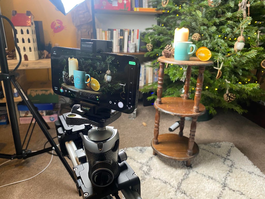我为最后一个镜头设置了舞台:圣诞树前的节日橙色松果装饰品。拍摄阶段像这样多花心思,对最终视频效果有巨大影响。Andrew Hoyle/CNET
