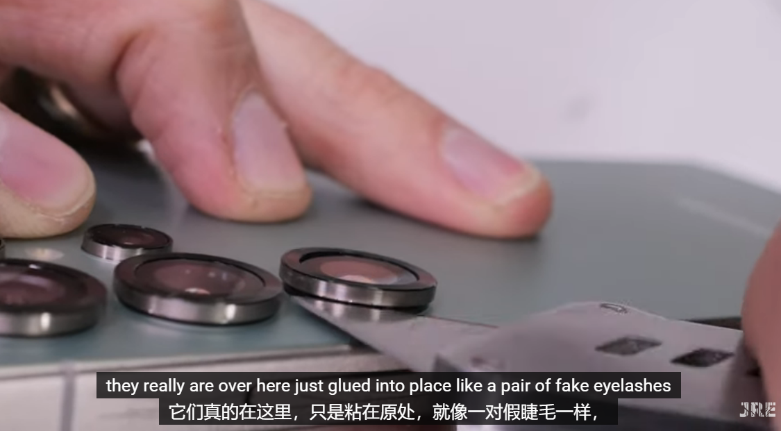 JerryRigEverything 试着用小刀翘了几下,发现镜头的金属环能拆卸下来,并称“像假睫毛一样粘在适当的位置”。