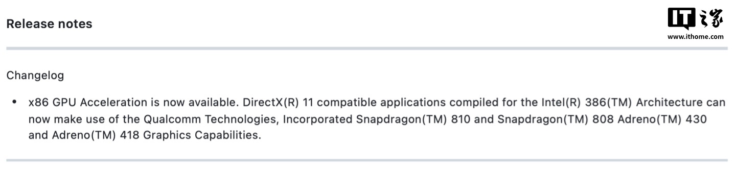 x86 GPU 加速现已正式启用。现在,所有基于 Intel 386 架构编译的 DirectX 11 应用都可以在高通骁龙 810/808 处理器上正常调用 GPU(Adreno 430/418),实现硬件加速图形渲染。