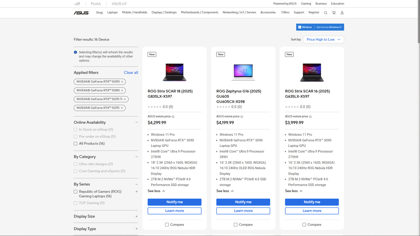 | ROG Strix Scar 18(G835LX-XS97) | 4,299.99 美元 | 4,199.99 美元 | RTX 5090 | Ultra 9 275HX | 18.5 英寸 2.5K 16:10 240Hz HDR | 2TB |